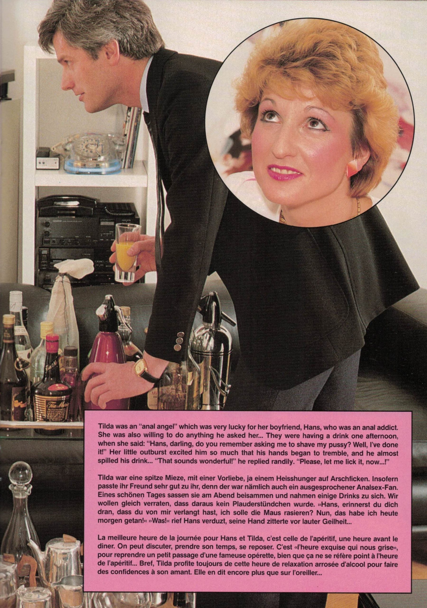 Tilda was an “anal angel” aka which was very lucky for her boyfriend, Hands, who was an anal sex addict. She was also willing to do anything he asked her… They were having a drink one afternoon, when she said: “Hans, darling, do you remember asking me to shave my pussy? Well, I’ve done it!” Her little outburst excited him so much that his hands began to tremble, and he almost spilled his drink… “That sounds wonderful!” he replied randily. “Please, let me lick it, now…!”