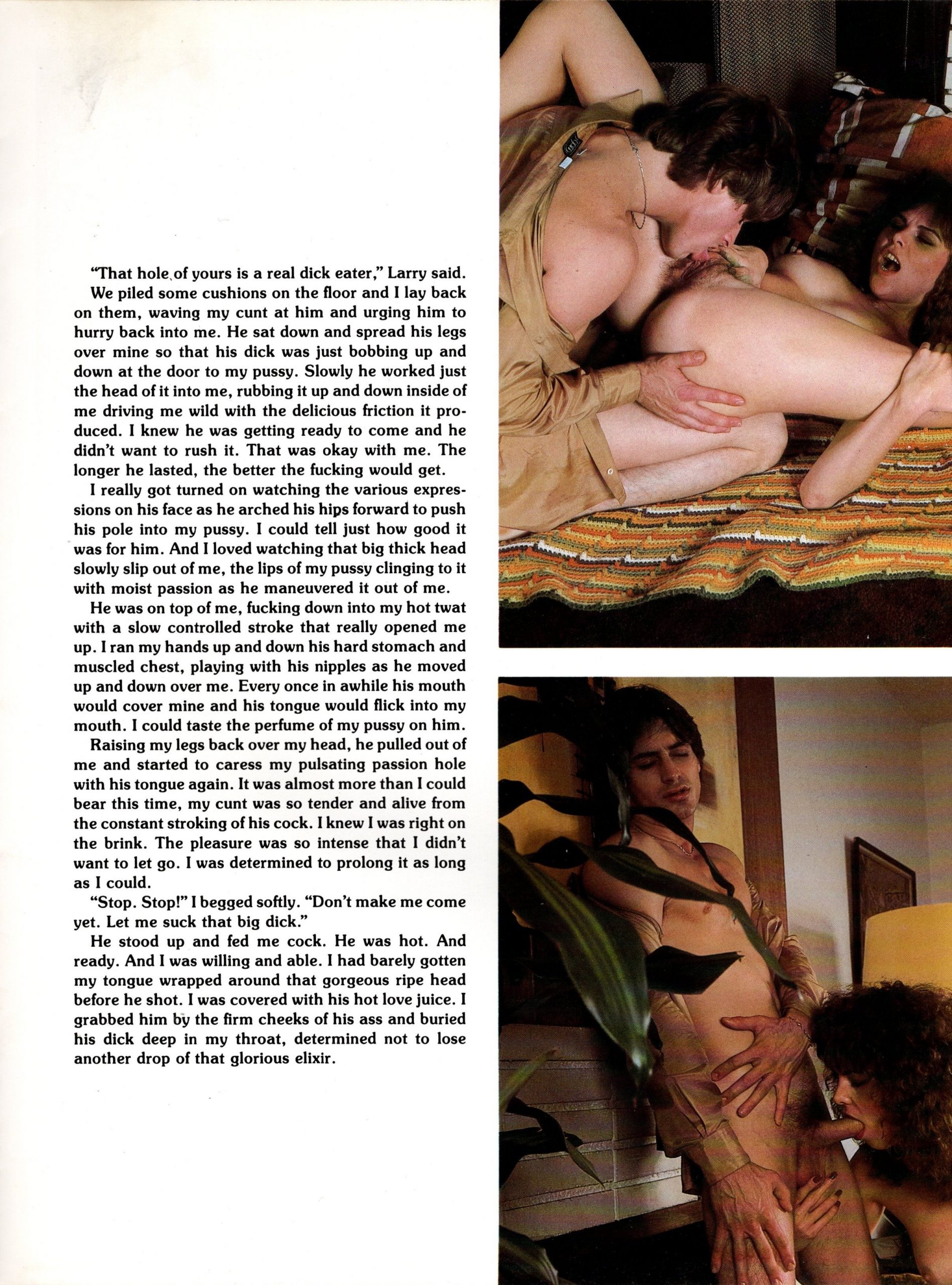“That hole, of yours is a real dick eater.” Larry said. We piled some cushions on the floor and I lay back on them, waving my cunt at him and urging him to hurry back into me. He sat down and spread his legs over mine so that his dick was just bobbing up and down at the door to my pussy. Slowly he worked just the head of it into me, rubbing it up and down inside of me driving me wild with the delicious friction it produced. I knew he was getting ready to come and he didn’t want to rush it. That was okay with me. The longer he lasted, the better the fucking would get.