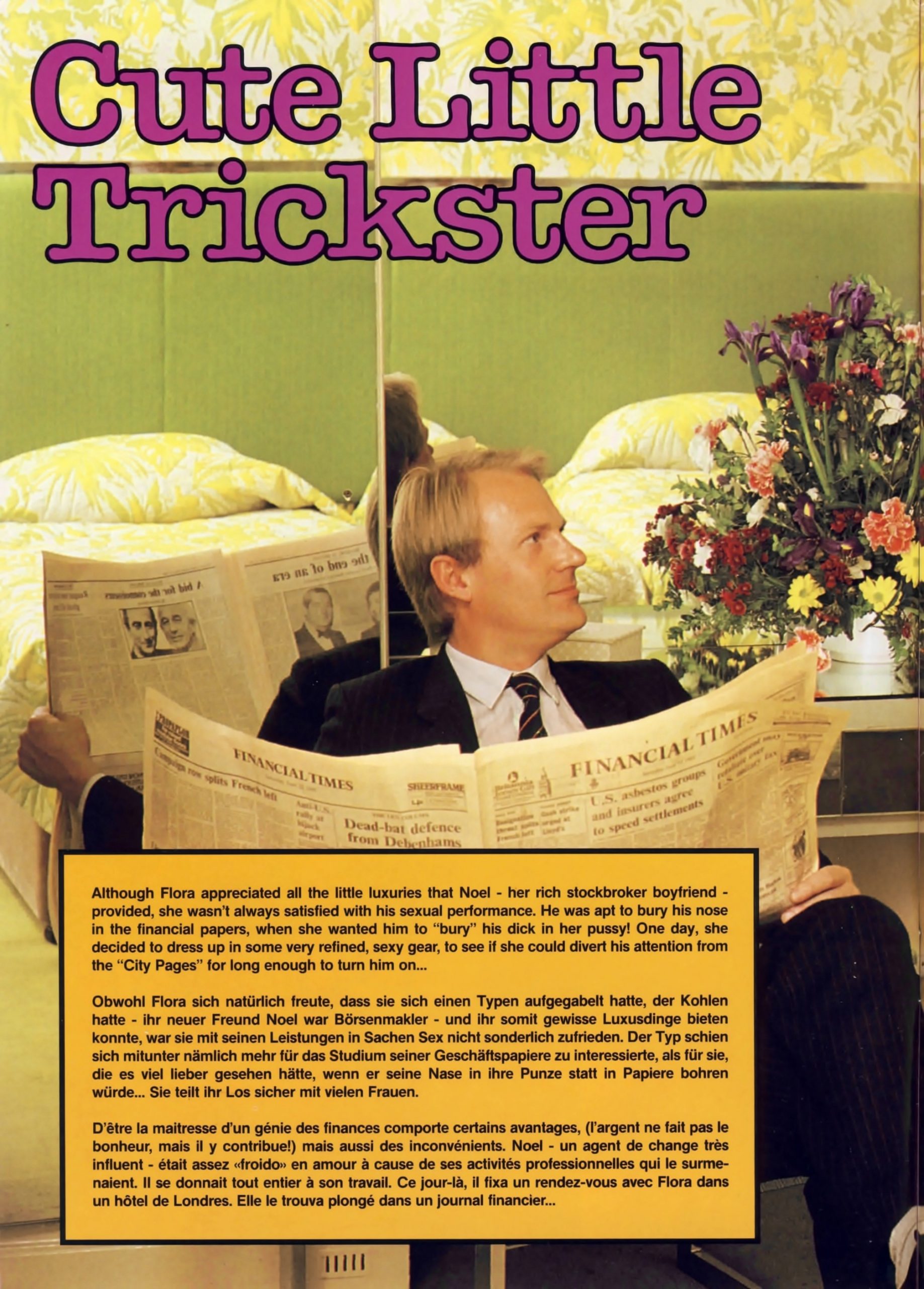 Although Flora appreciated all the little luxuries that Noel – her rich stockbroker boyfriend provided, she wasn’t always satisfied with his sexual performance. He was apt to bury his nose in the financial papers, when she wanted him to “bury” his dick in her pussy! One day, she decided to dress up in some refined sexy gear, to see if she could divert his attention from the “City Pages” for long enough to turn him on.