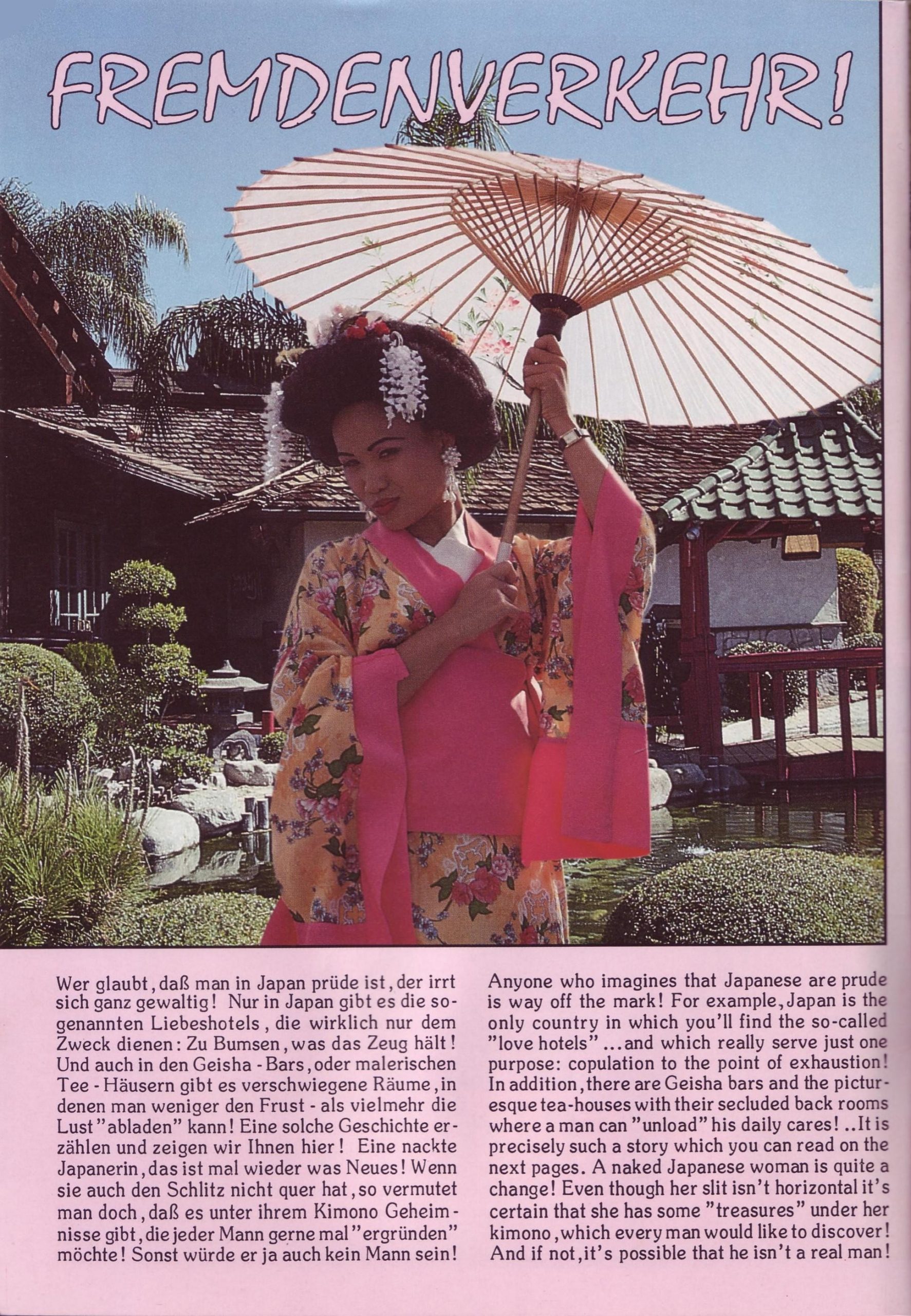 “Oh, that sure would be a great pity!” Quickly, the Japanese girl kneels in front of him.” …My countrymen have good staying-power, but you foreigners have larger pricks! … That’s why I’d like to get fucked by a big Western meatstick!” — “I always thought you already knew what it’s like… to have a big cock up your Japanese cunt!” … The man starts fucking her. “Now it’s your turn to say a word!” — “One word won’t be enough! gasps the Japanese girl.” …I need more to describe such an enormous pecker!”