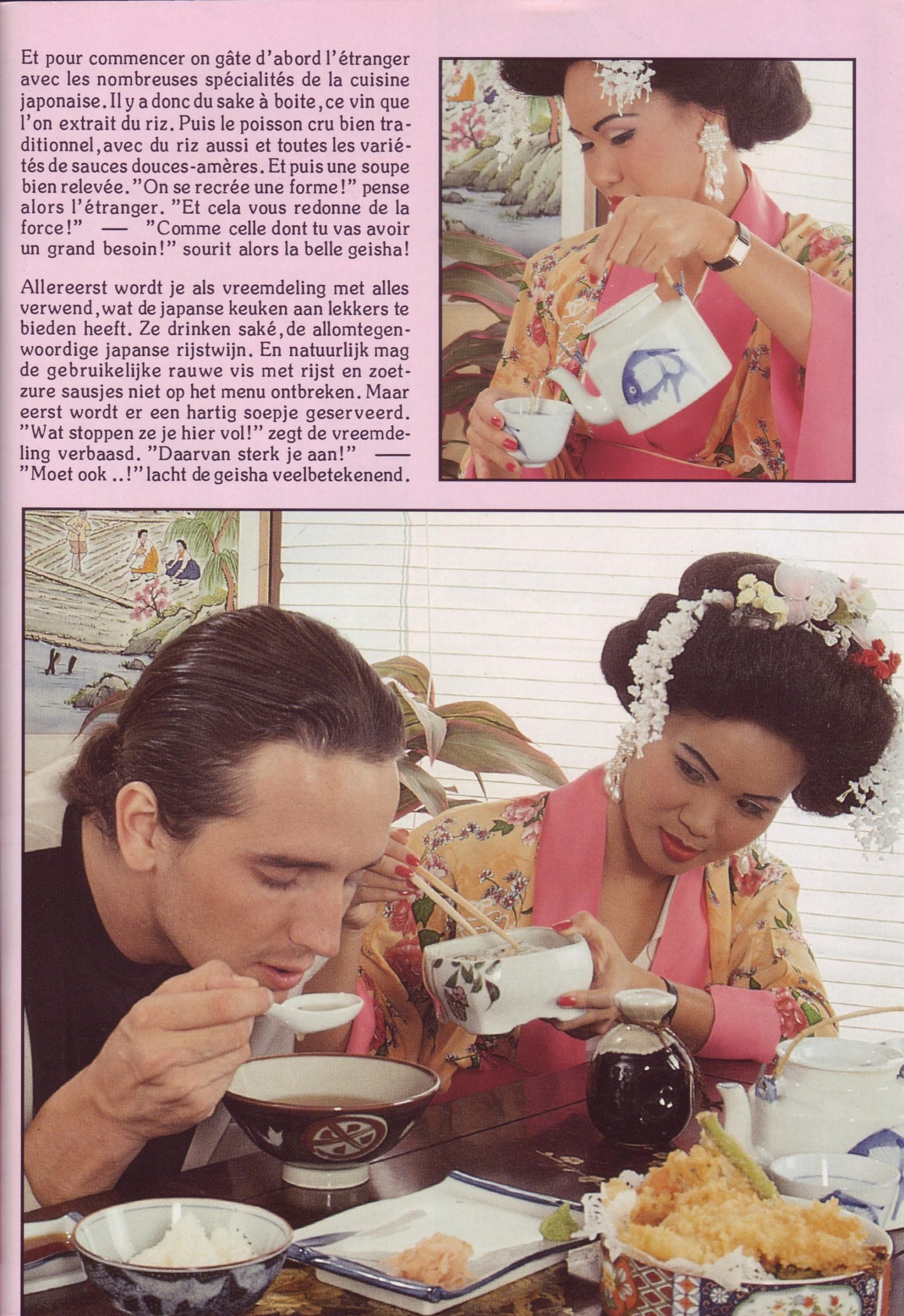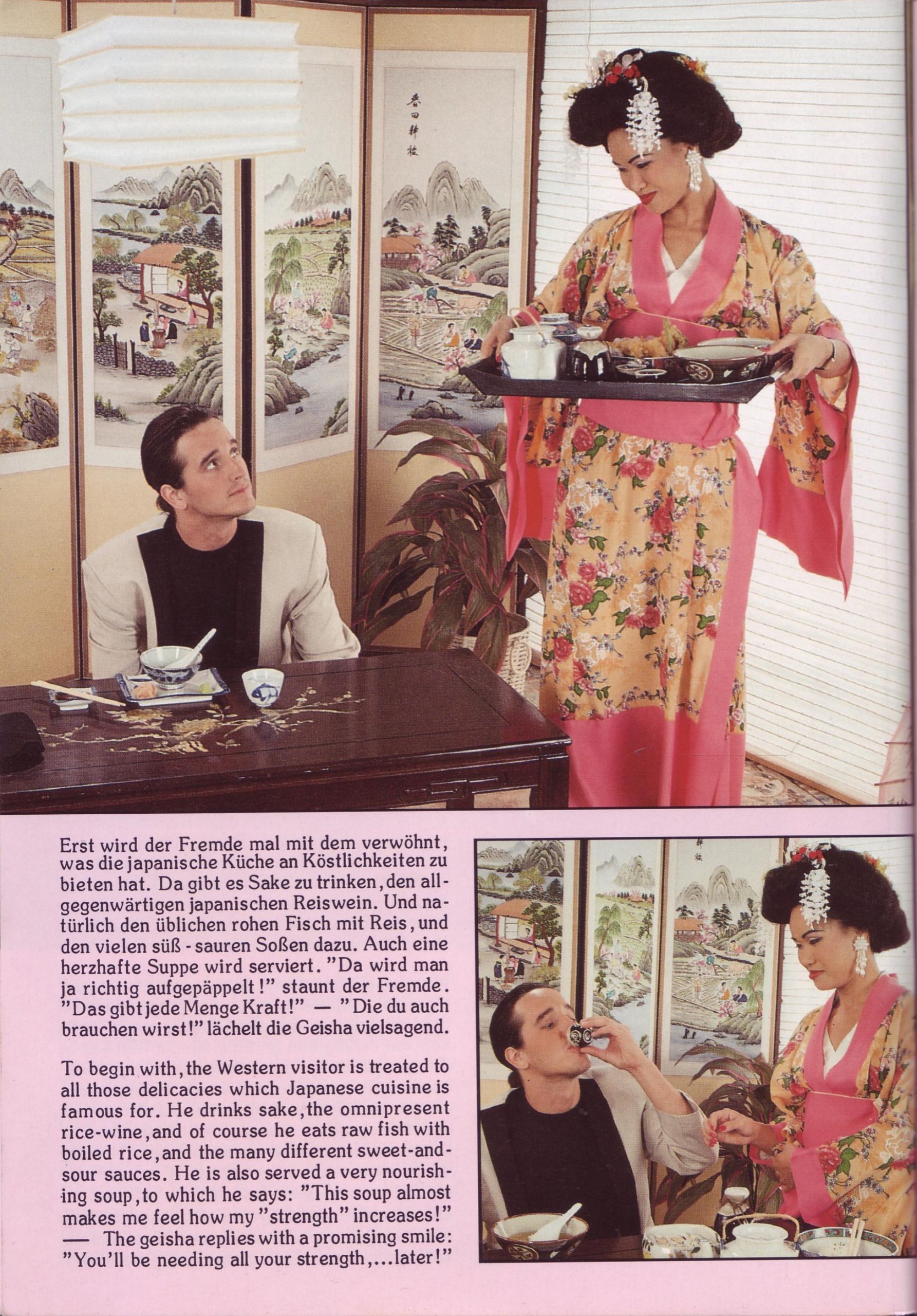 To begin with, the Western visitor is treated to all those delicacies which Japanese cuisine is famous for. He drinks sake, the omnipresent rice-wine, and of course he eats raw fish with boiled rice, and the many different sweet-and-sour sauces. He is also served a very nourishing soup, to which he says: “This soup almost makes me feel how my “strength” increases!” — The geisha replies with a promising smile: “You’ll be needing all your strength… later!”